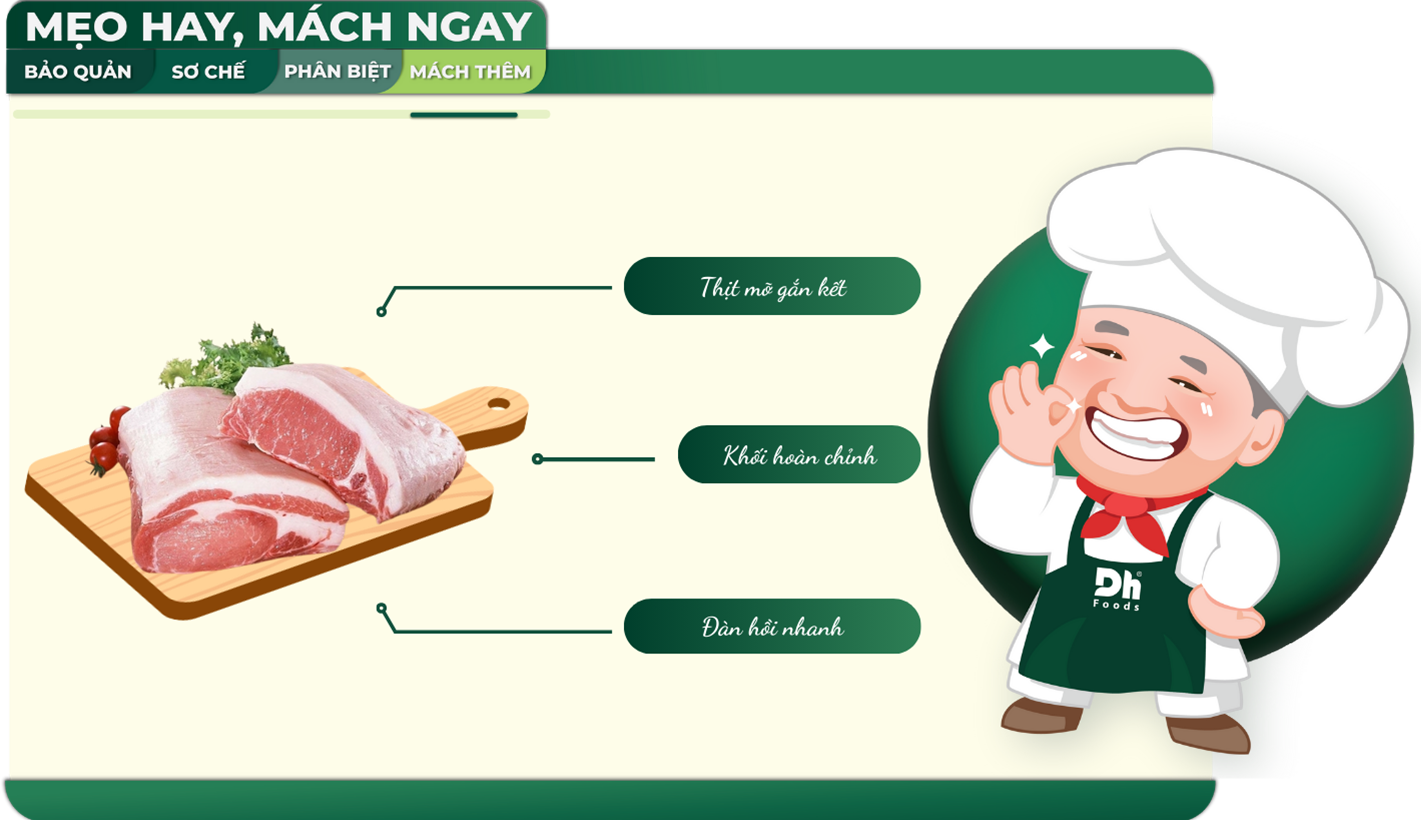 Nếu như khi cầm lên, phần thịt mỡ và nạc vẫn bám chặt nhau, không bị kéo giãn, chứng tỏ đó là khối thịt ngon, đảm bảo sau khi sơ chế và chế biến vẫn giữ được hình hài nguyên vẹn, tăng độ hấp dẫn cho món ăn. Đồng thời nếu khi dùng tay nhấn vào thịt, lập tức lún xuống và trồi lên lại, chứng tỏ thịt có độ đàn hồi tốt, thịt mới và ngon.