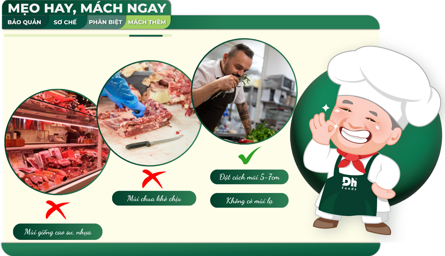 Khi mua bạn cầm và đặt thịt cách mũi tầm 5 - 7 cm, hít nhẹ, nếu như nhận thấy không có mùi gì, khả năng cao đó là miếng thịt bình thường. Ngược lại, nếu thấy có mùi nhựa, hơi giống cao su thì đó là thịt rã đông và tác nhân tạo ra mùi đó là lớp mỡ tan. Nếu có mùi chua, chứng tỏ thịt đã để lâu và bị oi chua do oxi hoá.