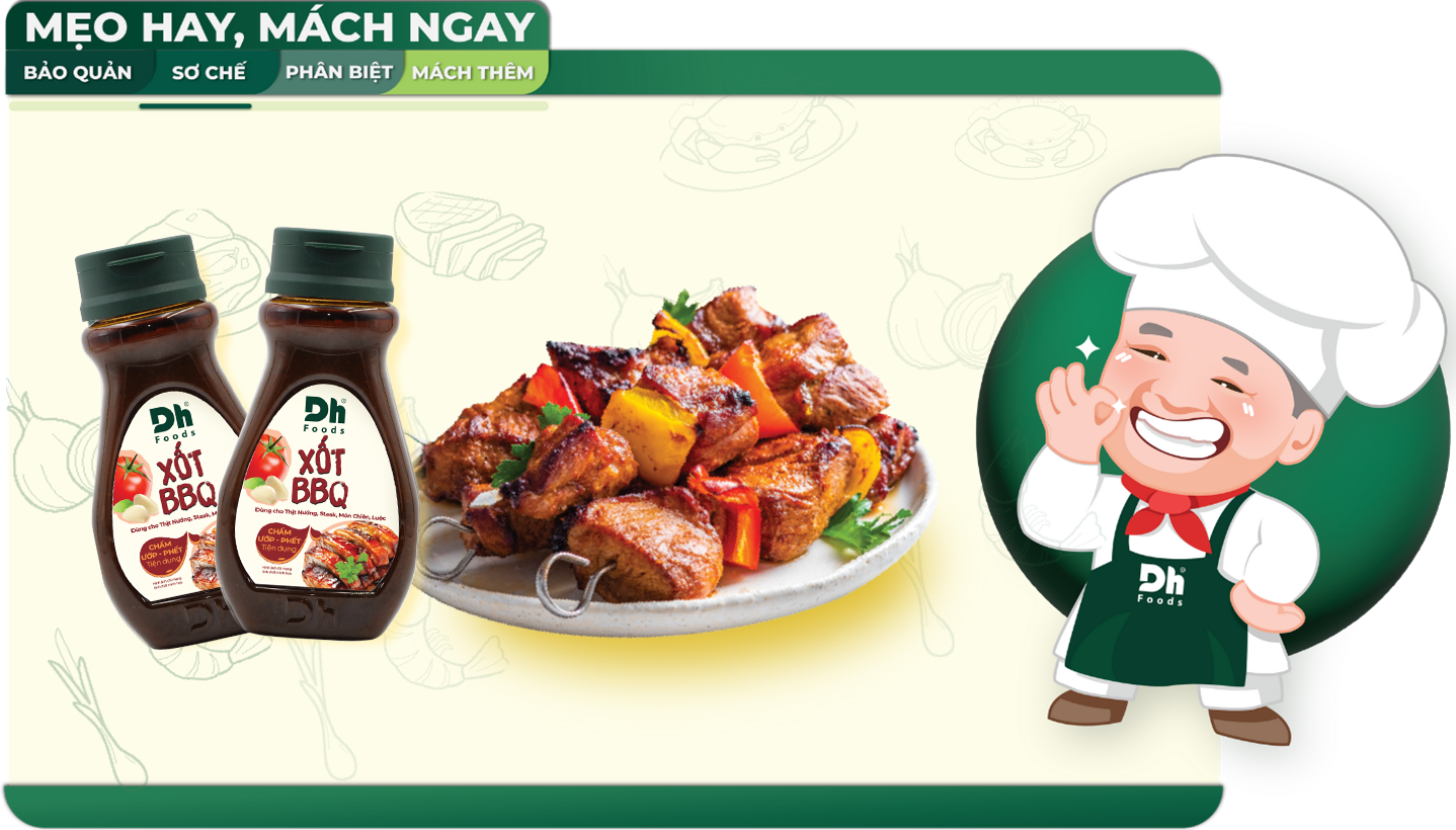 Có được loại thịt phù hợp rồi, việc còn lại là ướp cho thật khéo, nhưng không phải ai cũng có thời gian để chăm chút nấu ăn đúng không nè? Cho nên để tiện lợi và an toàn nhất ta nên chọn Xốt BBQ của Dh Foods, vừa đảm bảo vị đậm đà ngon miệng, hương thơm hấp dẫn, màu sắc bắt mắt mà còn dễ dàng.