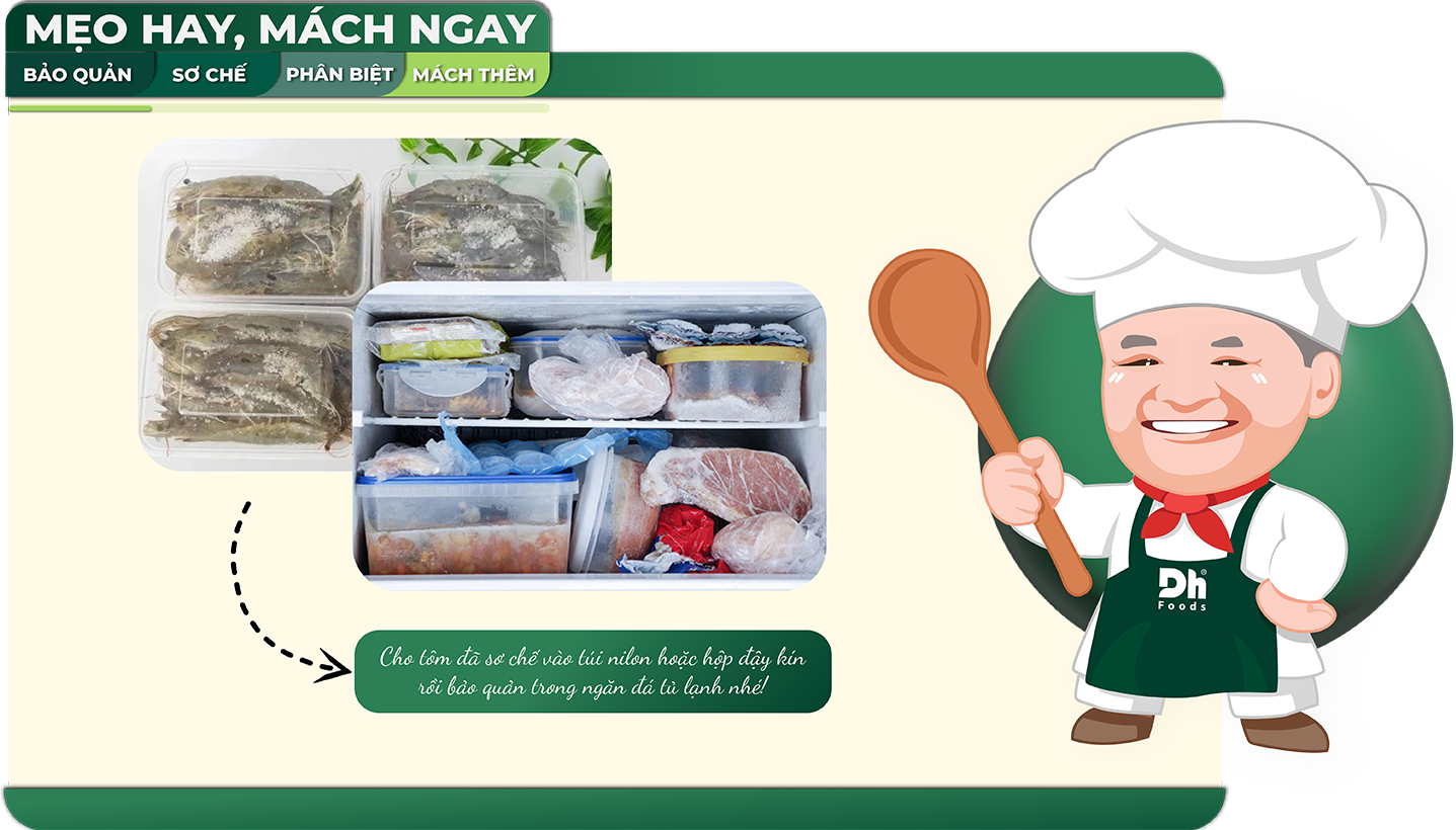 Sau đó, bỏ tôm vào hộp kín hoặc túi nilon và bảo quản trong ngăn đá tủ lạnh. Cách này giúp tôm giữ được độ tươi ngon khá lâu. Tuy nhiên, để đảm bảo độ ngon và giá trị dinh dưỡng, bạn nên sử dụng tôm trong vòng 30 ngày.
