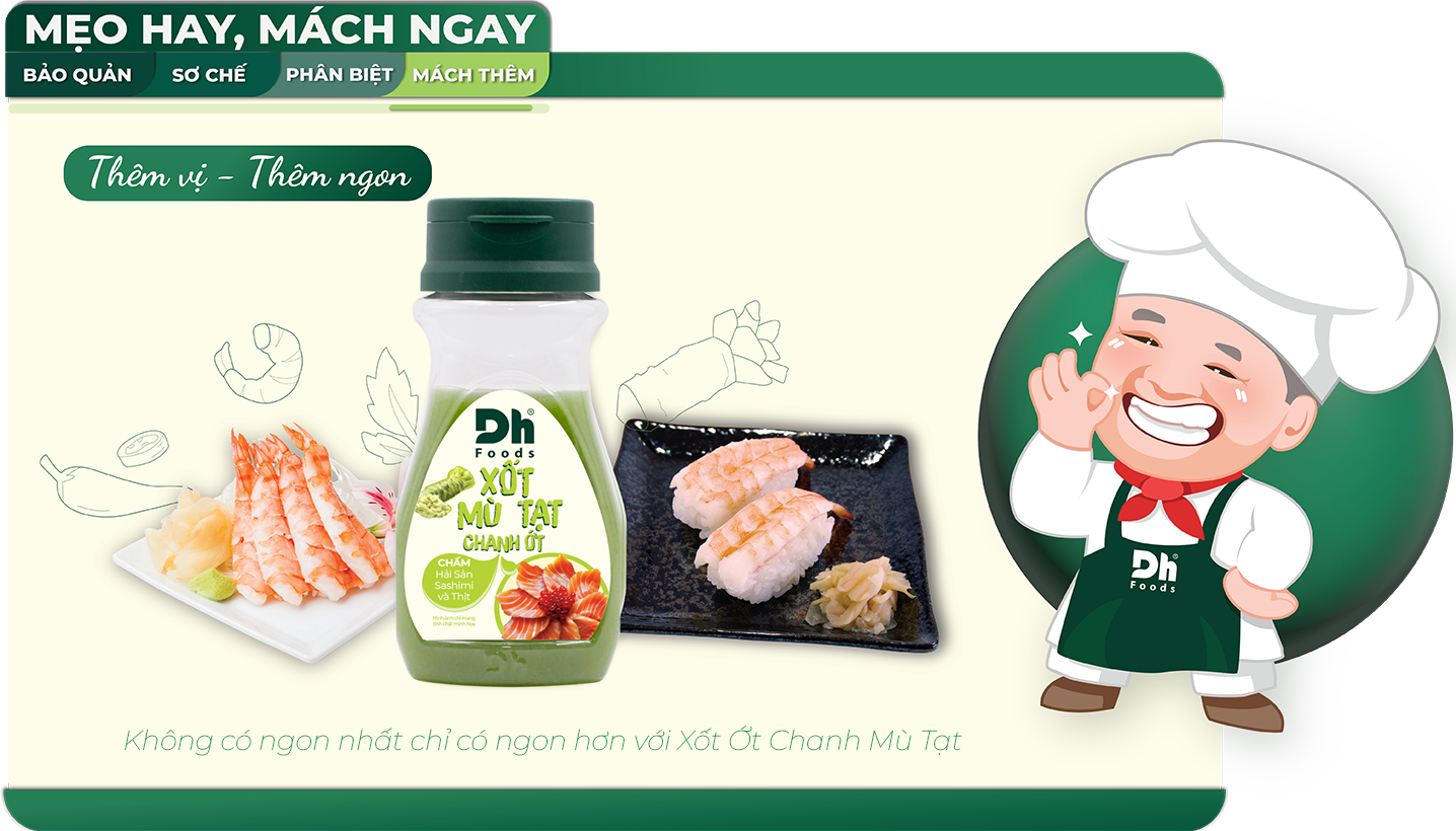 Món sushi, sashimi sẽ càng bắt vị hơn khi có Xốt Ớt Chanh Mù Tạt của Dh Foods đi cùng. Vị mù tạt không quá gắt, thơm nồng vừa phải, xen lẫn vị chua nhè nhẹ giúp vị ngọt của tôm tươi càng thêm nổi bật và cuốn hút. Không chỉ tôm mà các loại hải sản nói chung sẽ nhân đôi độ ngon khi chấm cùng Xốt Ớt Chanh Mù Tạt.