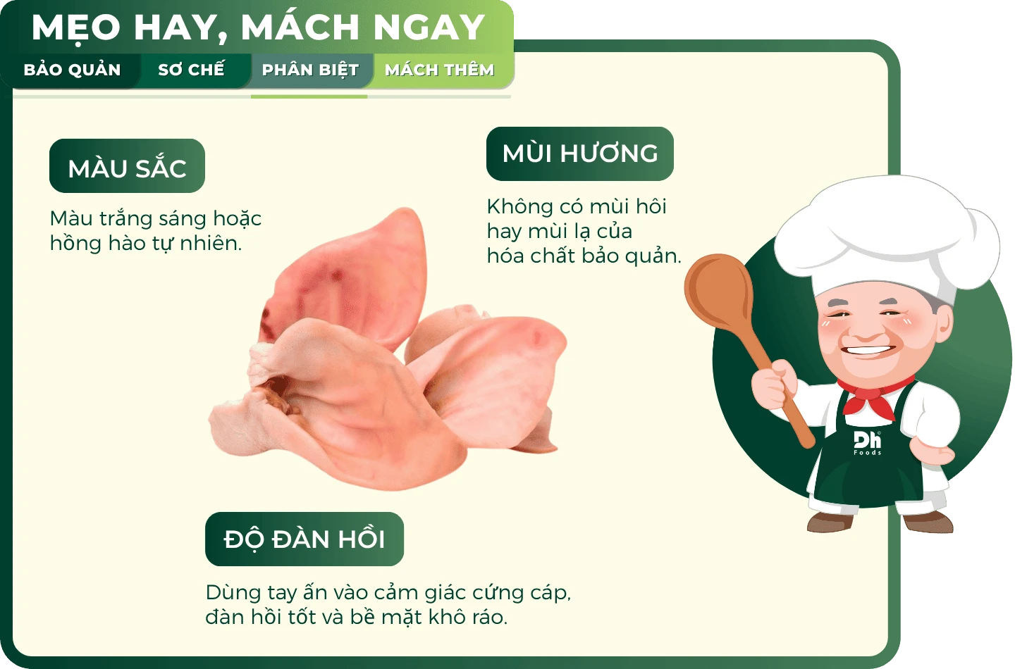 Dùng tay ấn vào phần lỗ tai, nếu thấy cảm giác cứng cáp, đàn hồi tốt và bề mặt khô ráo thì đó là tai heo tươi.