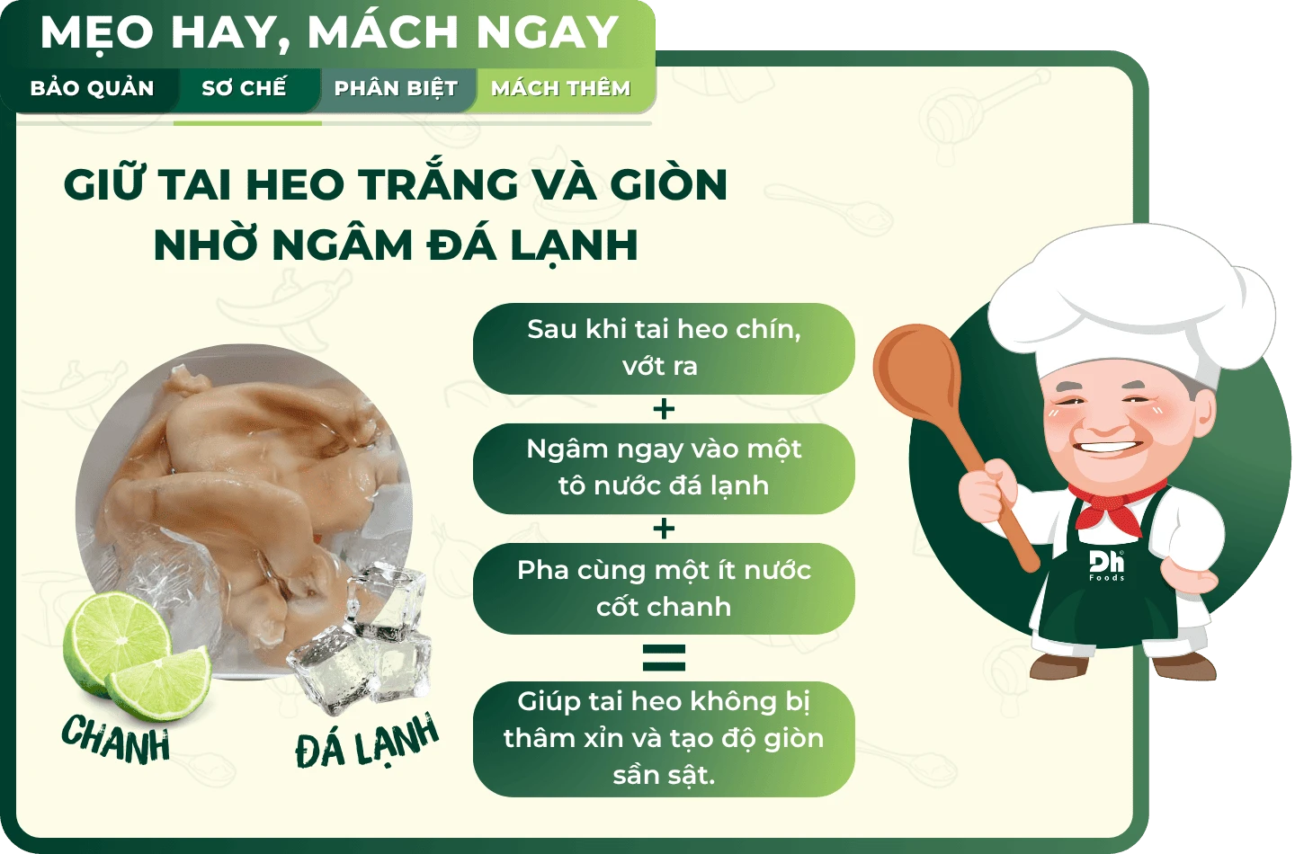 Để tai heo sau khi luộc luôn trắng và thơm, sẵn sàng cho bạn chế biến vạn món ngon. Dh foods mách bạn hai mẹo nhỏ nhưng có võ này đê trổ tài ngay cho gia đình và bạn bè nhé!
