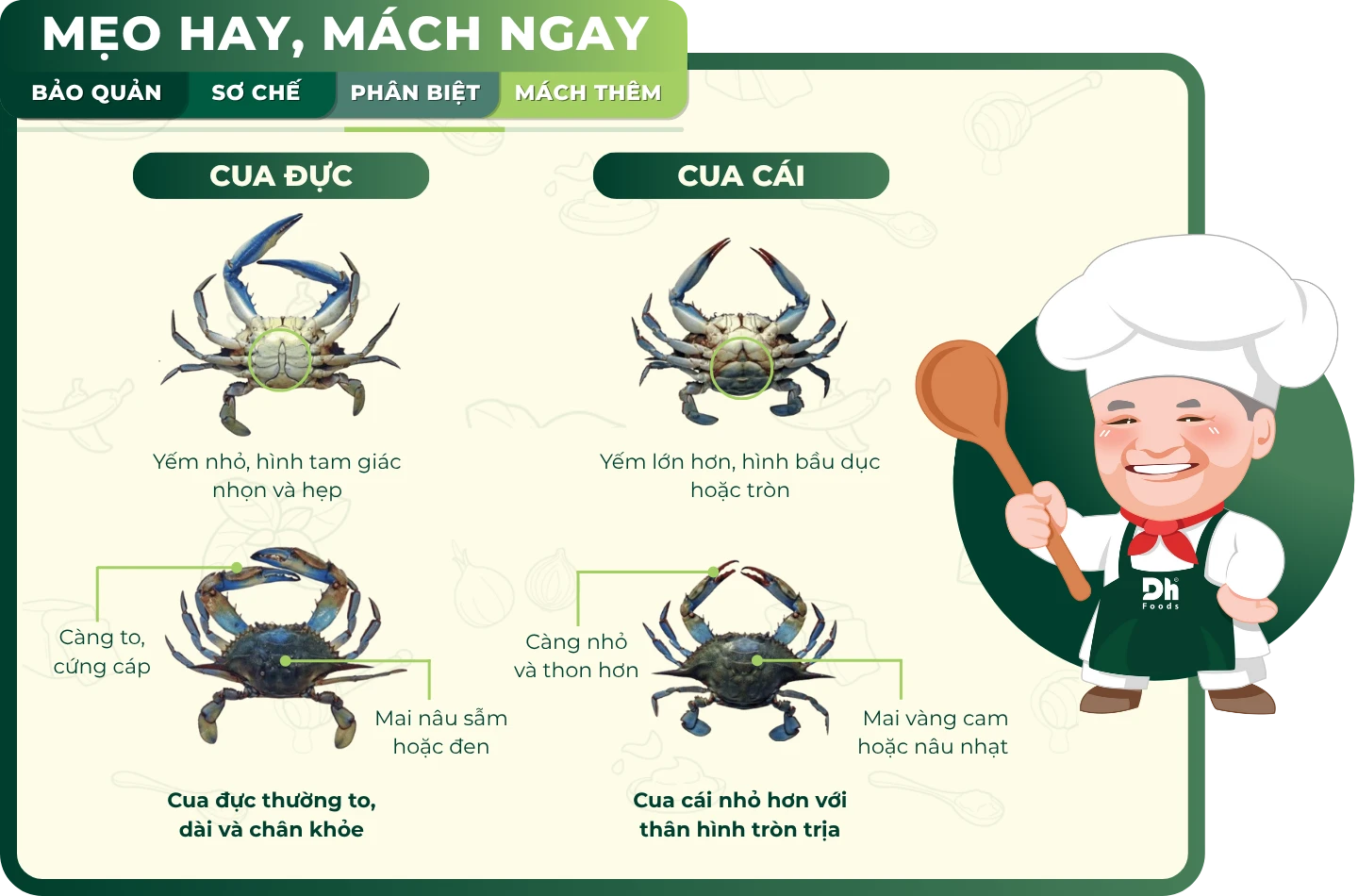 Dh Foods mong rằng những mẹo nhỏ trên sẽ giúp bạn dễ dàng phân biệt cua đực và cua cái cũng như tự tin chọn được những con cua ngon, chắc thịt mà không bị ốp mỗi khi đi chợ. Hy vọng bạn sẽ luôn có những trải nghiệm nấu ăn thú vị và thật nhiều bữa ăn ngon bên người thân bạn nhé!