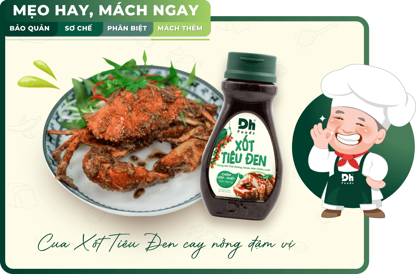 Chọn được cua chắc thịt. không bị ốp rồi thì ngần ngại gì mà không thử ngay món Cua Xốt Tiêu Đen bạn nhỉ? Dh Foods gợi ý cho bạn Cách làm Cua Xốt Tiêu Đen cay nồng, đậm vị với sự kết hợp giữa Cua Cà Mau ngon ngọt tự nhiên và Xốt Tiêu Đen Dh Foods the the kích thích đầu lưỡi. Chắc chắn đây sẽ là lựa chọn hoàn hảo cho bữa tiệc cuối tuần cùng gia đình!