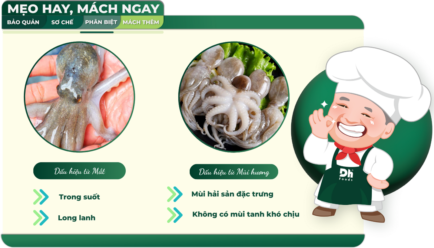 Đôi mắt và màu sắc là dấu hiệu chuẩn để xác định độ tươi của bạch tuộc