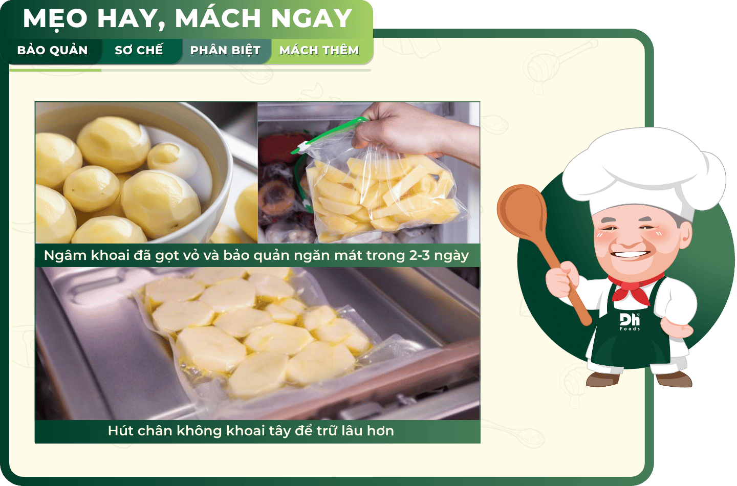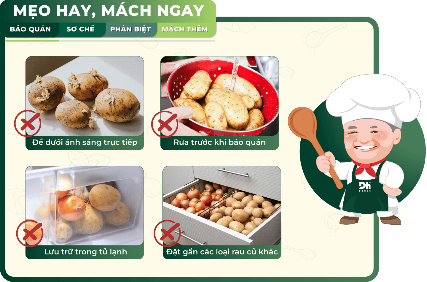 Vậy là Dh Foods đã bật mí những bí quyết đơn giản mà hiệu quả để bạn có thể giữ khoai tây tươi lâu mà không lo khoai tây mọc mầm hay mất chất dinh dưỡng. Giờ thì bạn chỉ cần áp dụng và sẵn sàng chế biến những món khoai thơm ngon, đầy dinh dưỡng cho cả gia đình thưởng thức.