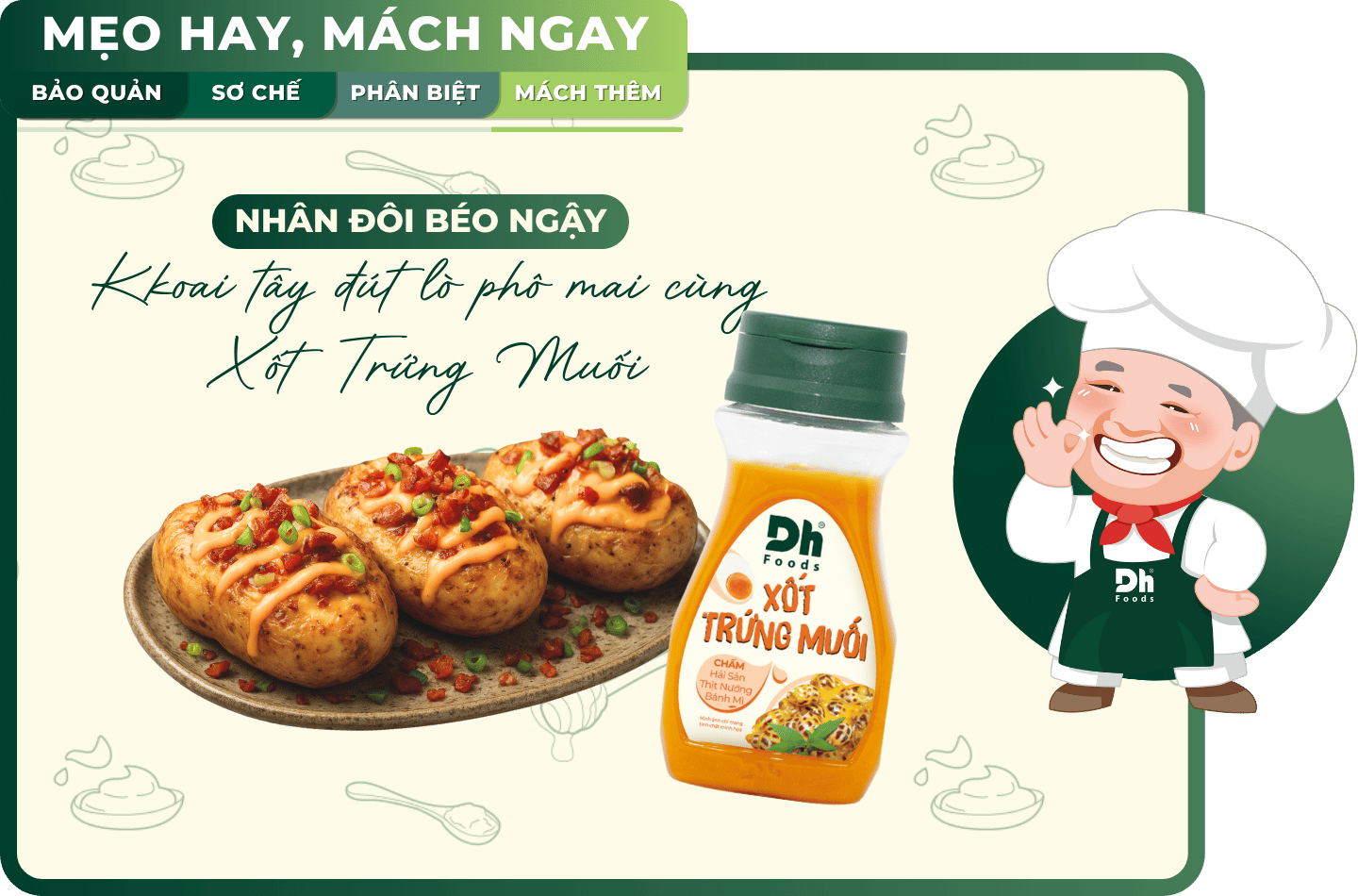 Sau khi biết cách bảo quản khoai tây tươi được lâu, không bị mọc mầm mà vẫn giữ được hương vị và độ bùi tự nhiên, giờ là lúc bạn chế biến chúng thành một món ăn hấp dẫn khó cưỡng. Thử ngay món khoai tây đút lò phô mai rưới thêm Xốt Trứng Muối Dh Foods béo mặn đặc trưng. Lớp khoai nóng hổi, mềm mịn bên trong, giòn nhẹ bên ngoài hòa quyện với phô mai tan chảy và xốt trứng muối đậm đà sẽ mang đến trải nghiệm x2 béo ngậy, ăn một miếng là mê ngay.