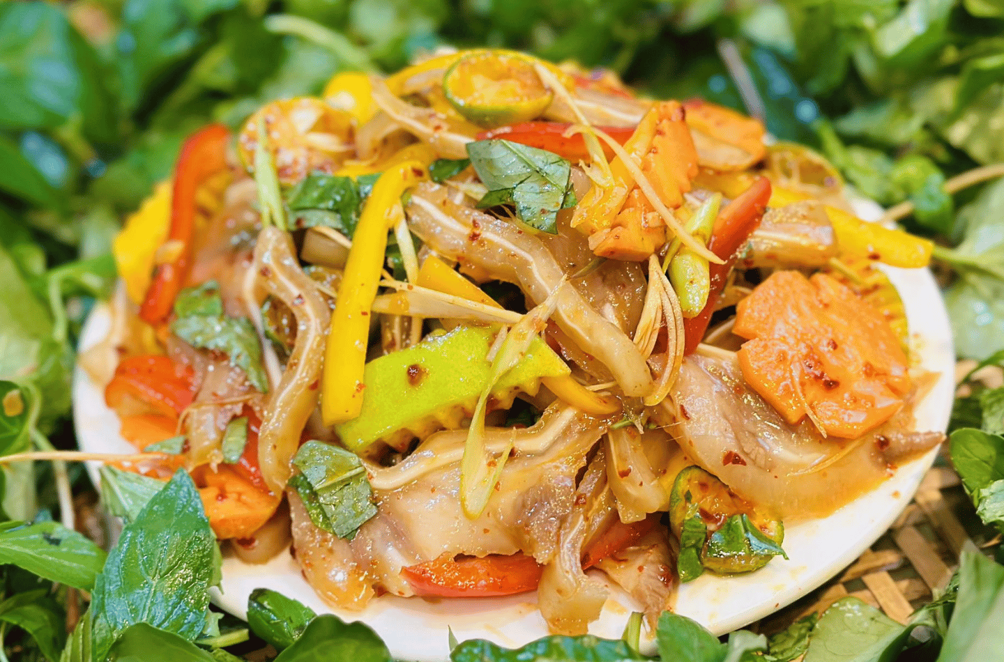 Khác với những món thịt heo quen thuộc, tai heo xốt Thái tạo điểm nhấn nhờ sự kết hợp đặc sắc của vị chua, cay, mặn, ngọt cùng mùi thơm tươi mát của sả tắc. Đây là món ăn tưởng chừng đơn giản nhưng lại đưa cơm đến bất ngờ và cũng rất lý tưởng để nhâm nhi với bạn bè.