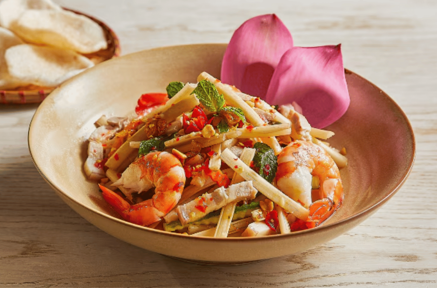 Gỏi ngó sen tôm thịt gây ấn tượng bởi độ giòn đặc trưng của ngó sen cùng vị ngọt mềm của tôm tươi và thịt luộc. Khi trộn cùng nước mắm chua ngọt và rau thơm, món ăn trở nên hài hòa cả về hương vị lẫn màu sắc, mang lại cảm giác ngon miệng và dễ chịu cho người thưởng thức.