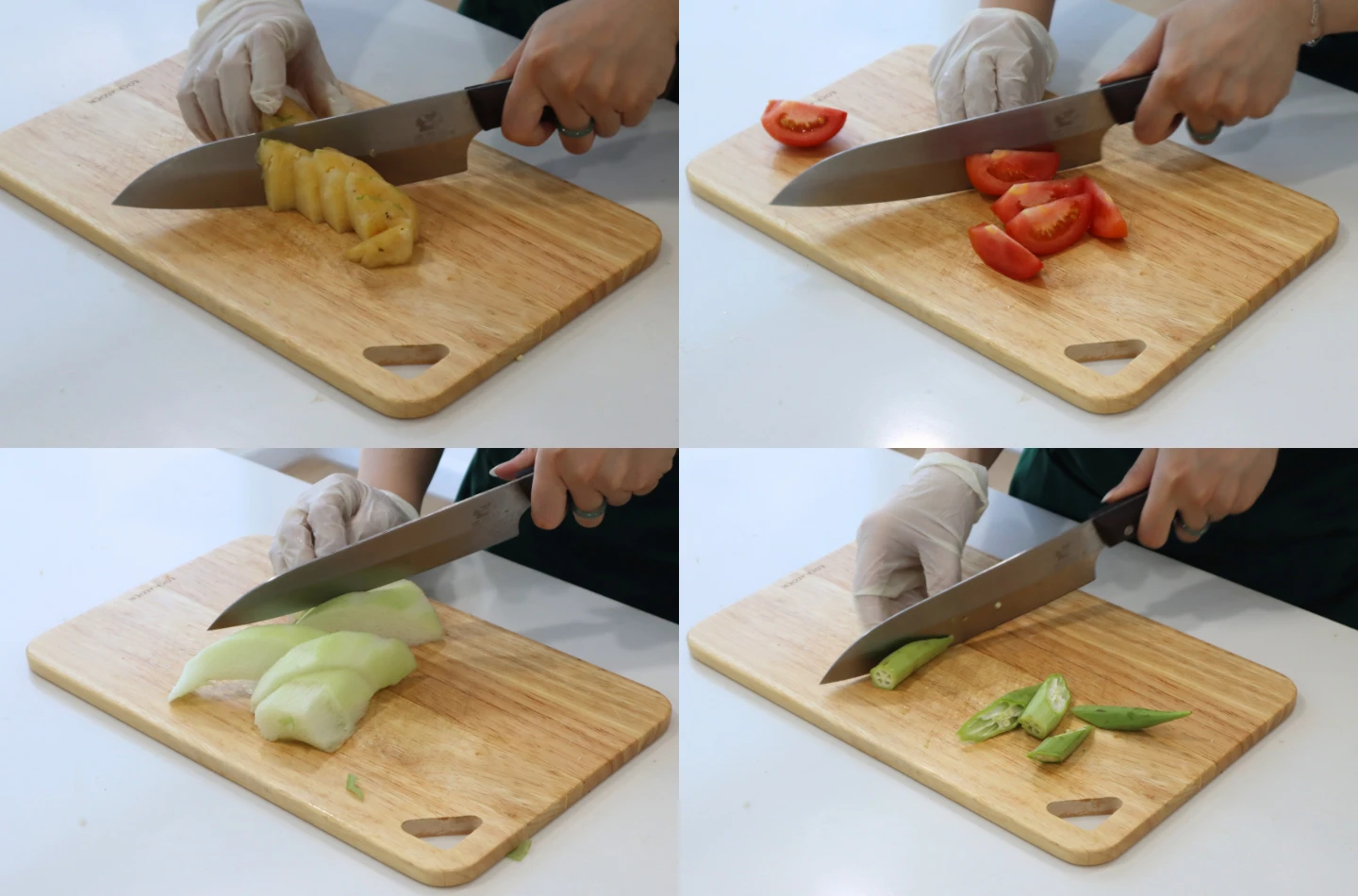 Thơm cắt bỏ mắt và thái lát vừa ăn. Cà chua thái múi cau, đậu bắp cắt bỏ đầu và thái lát.