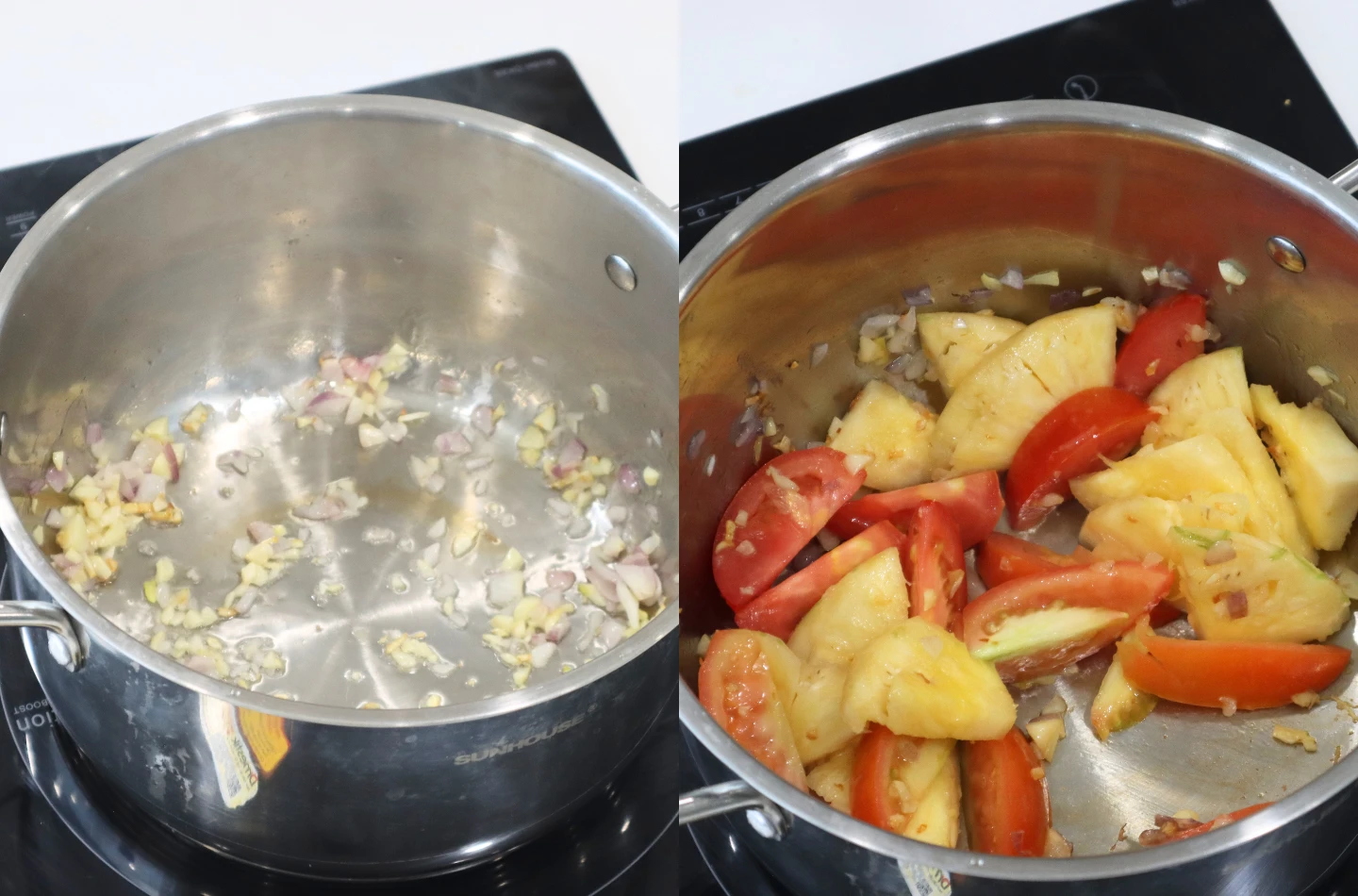 Đun nóng dầu trong nồi, khi dầu bắt đầu sôi thì cho hành tím và tỏi băm vào phi cho dậy mùi thơm. Khi hành tỏi chuyển sang màu vàng nhẹ, thêm cà chua và thơm cắt miếng vào, đảo đều khoảng 2 phút.