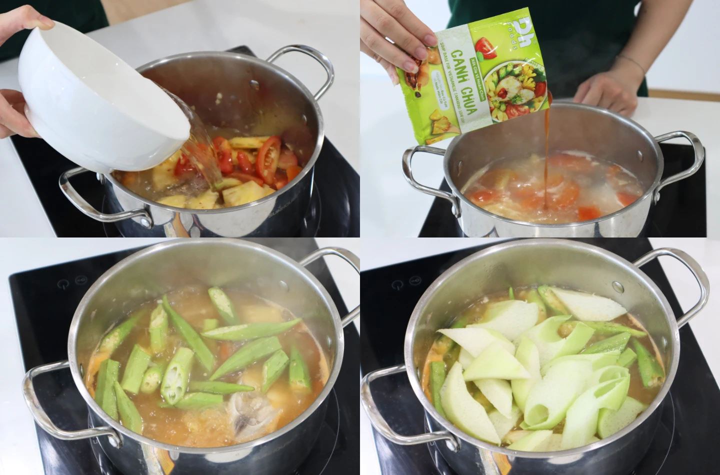 Sau khi xào thơm và cà chua, đổ thêm 700ml nước vào nồi và đun sôi trên lửa lớn. Khi nước sôi, cho cá vào nấu khoảng 5 phút trên lửa vừa để cá chín tới. Sau đó, cho một gói Xốt Gia Vị Hoàn Chỉnh Canh Chua Dh Foods vào và khuấy đều, không cần nêm thêm gia vị.
