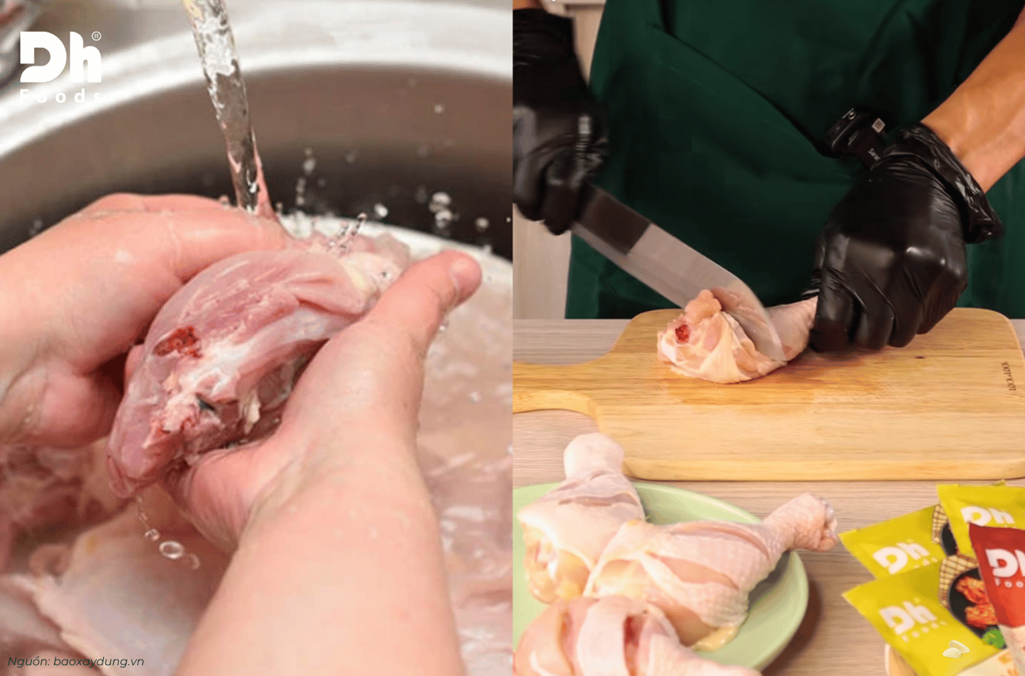 Cho đùi gà cùng 1 muỗng canh giấm và 50gr muối vào thau, xoa bóp kĩ càng để loại bỏ mùi tanh. Sau đó, rửa thật sạch lại với nước rồi để cho thật ráo.