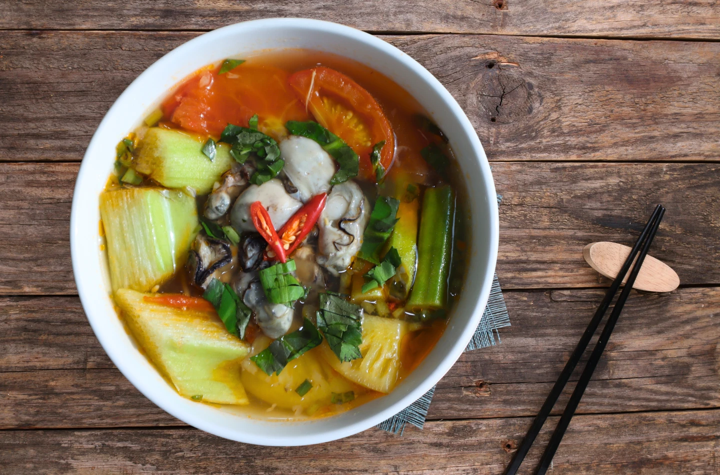 Hành tím và tỏi bóc vỏ, băm nhuyễn; ớt rửa sạch, thái lát. Rau răm, húng lủi và ngò rí nhặt sạch, rửa kỹ rồi để ráo nước.