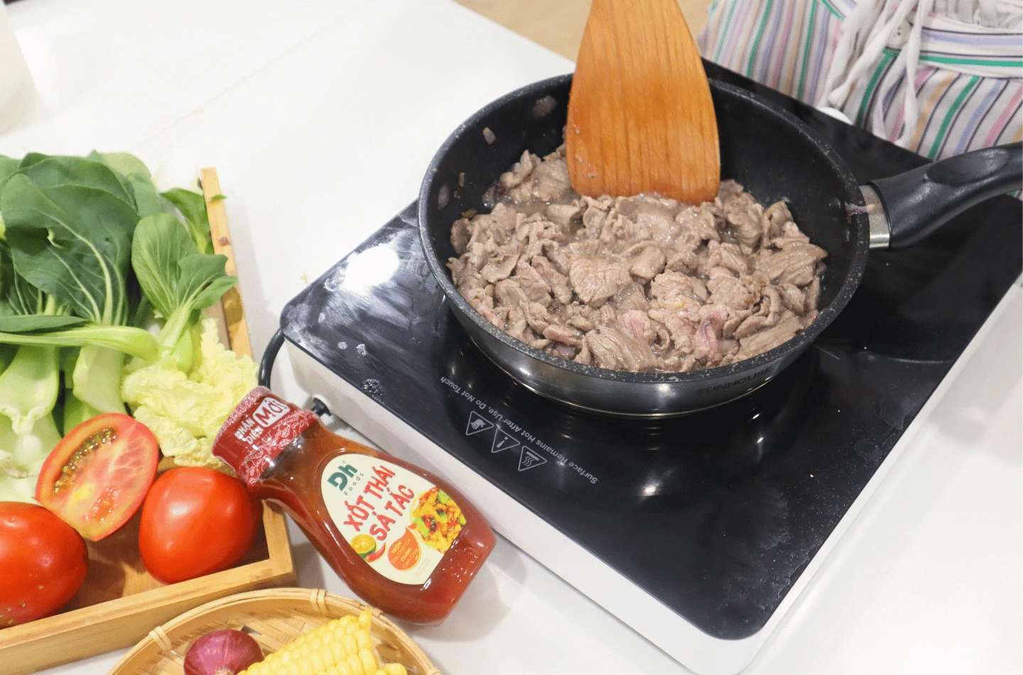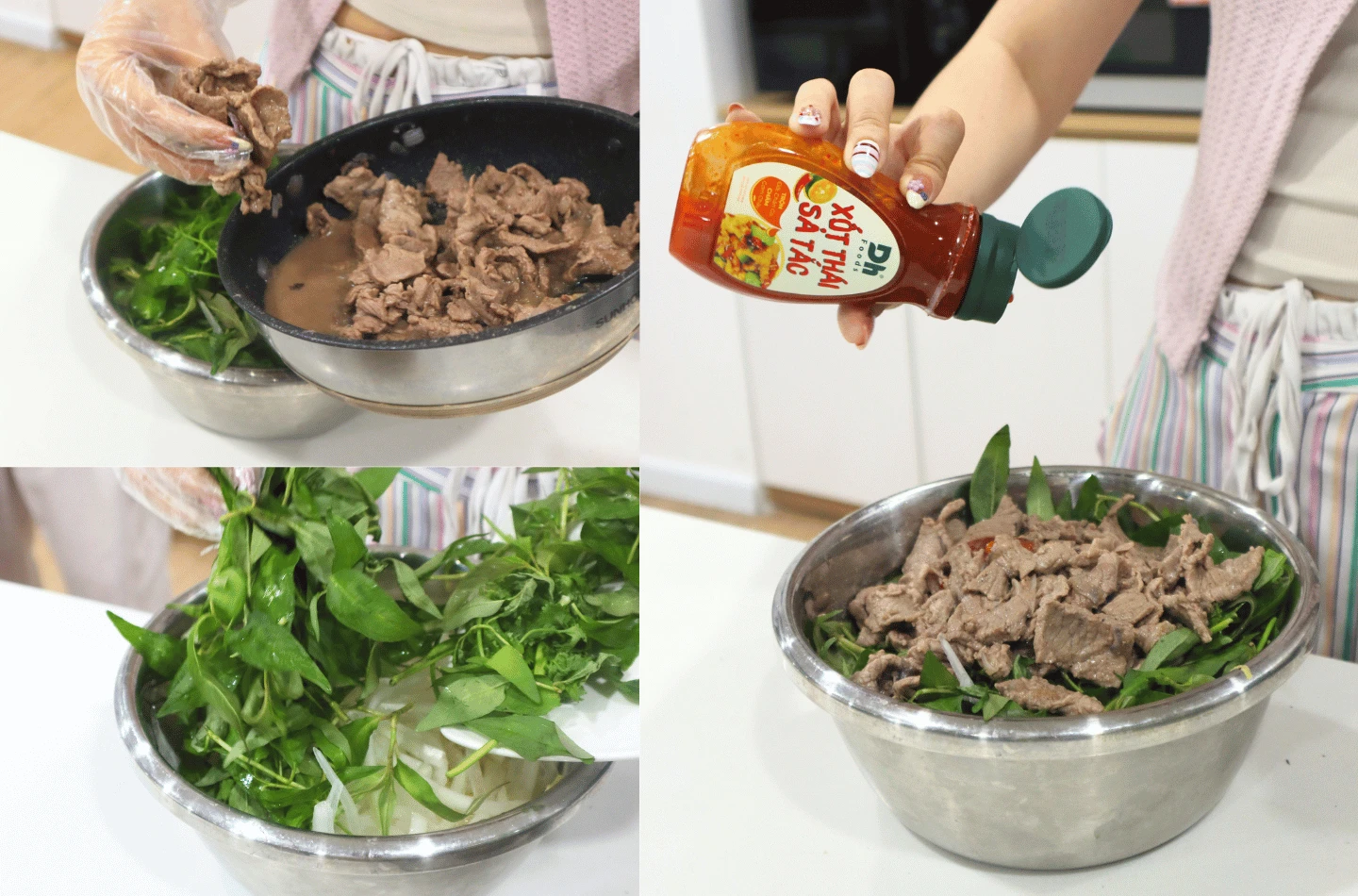 Cho xoài xanh, hành tây cùng các loại rau thơm vào tô lớn, sau đó thêm thịt bò đã xào. Rưới Xốt Thái Sả Tắc của Dh Foods vào, nhẹ tay trộn đều để từng nguyên liệu thấm đẫm lớp xốt sả tắc đậm đà. Có thể điều chỉnh lượng xốt tùy khẩu vị để đạt độ cân bằng mong muốn