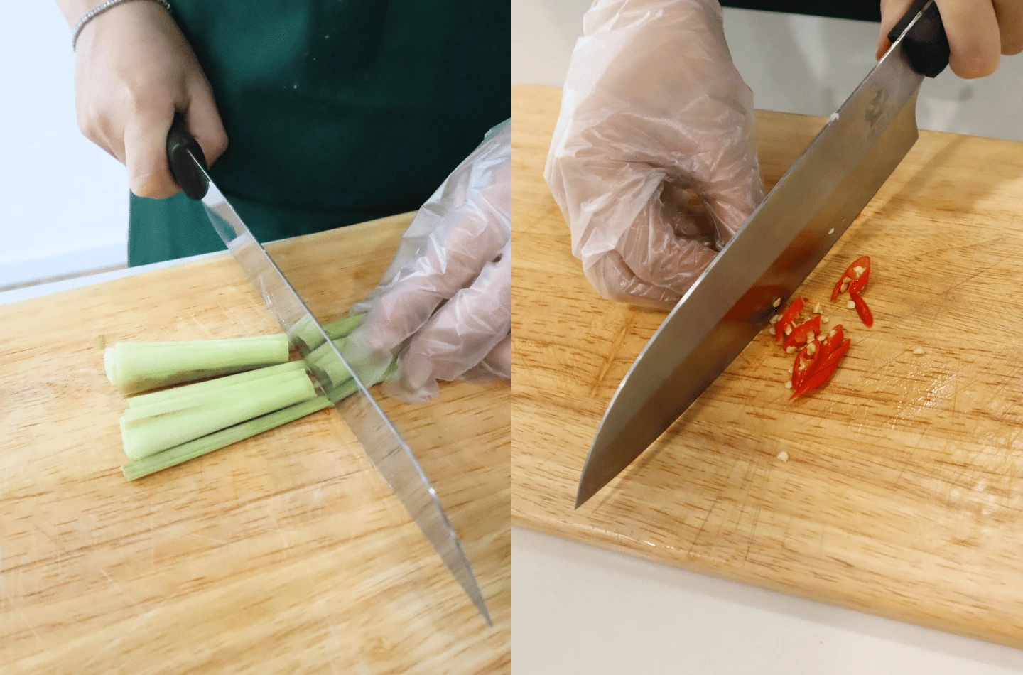 Sả cắt thành khúc lớn, đập dập cho dậy mùi. Ớt cắt nhỏ.