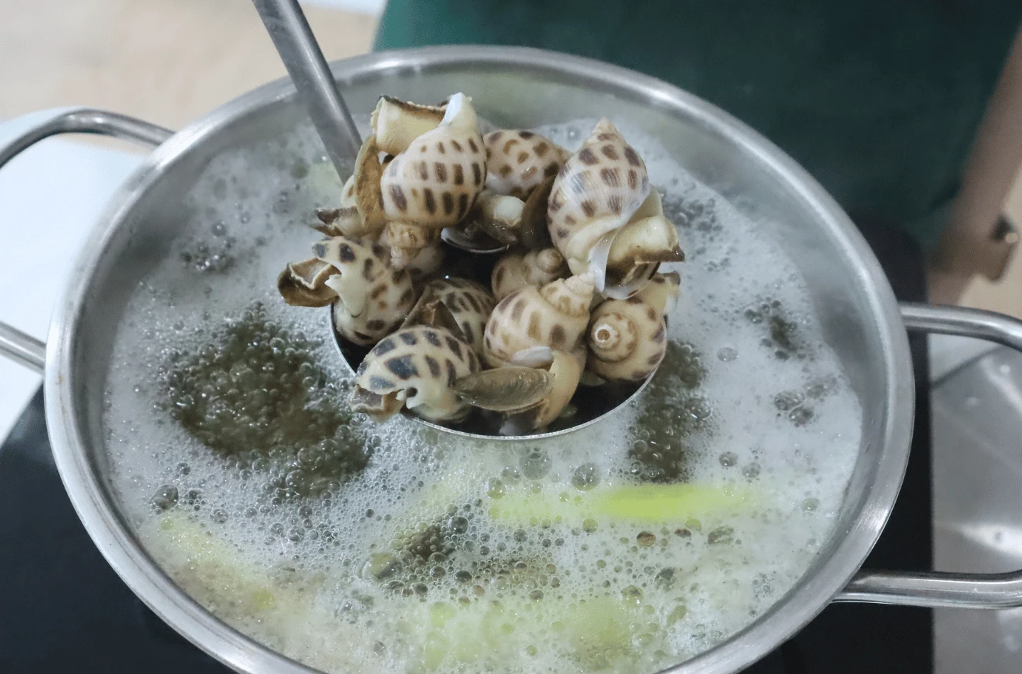 Luộc ốc hương trong vòng 2-3 phút đến khi vừa mở miệng thì để ráo.