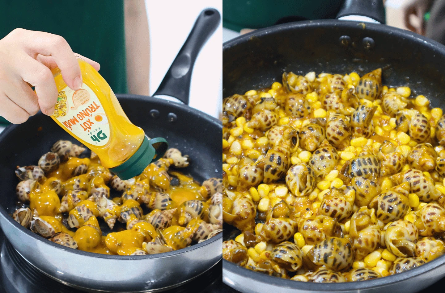 Ốc hương sốt trứng muối béo ngậy vừa phải, dùng kèm bánh mì để có thể thưởng thức trọn vẹn. Nhờ Xốt Trứng Muối Dh Foods mà món ăn trở nên đơn giản hơn, vị hài hoà dễ chịu mà không cần nguyên liệu phức tạp. Phù hợp chiêu đãi các buổi tất niên tại nhà hoặc các bữa tiệc gia đình.