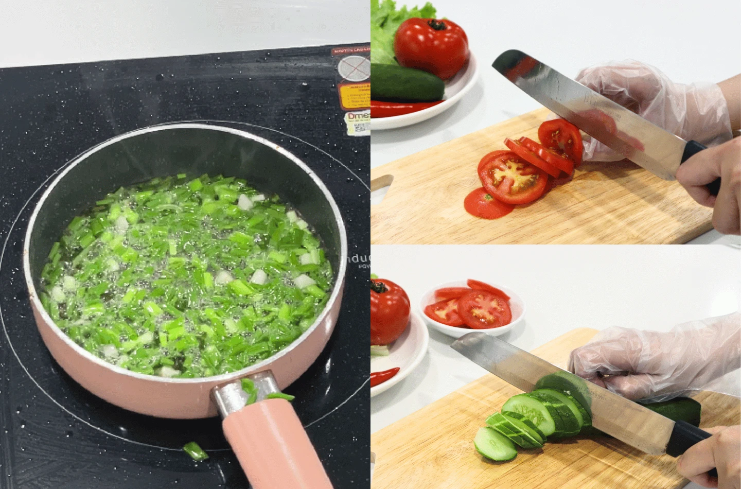 Đồng thời, rửa sạch xà lách, dưa leo, cà chua và hành lá để chuẩn bị cho món ăn kèm.