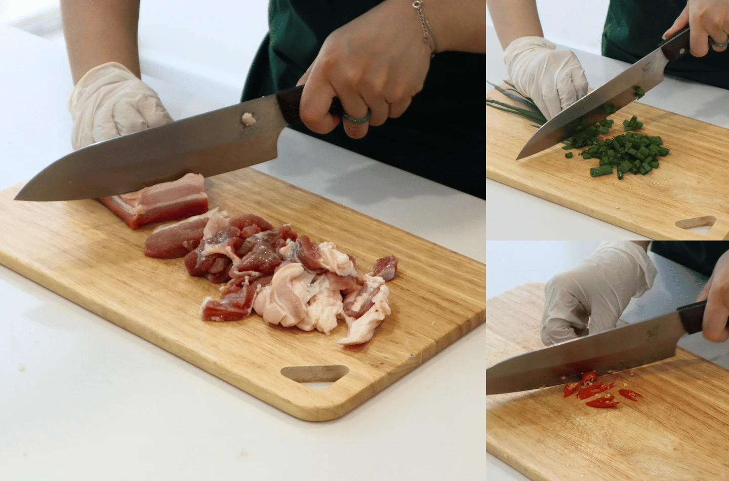 Thịt ba chỉ sau khi mua về ngâm qua nước muối loãng, rửa sạch rồi để ráo, sau đó cắt thành từng miếng vừa ăn. Đồng thời, rửa sạch hành lá và ớt rồi cắt nhỏ để chuẩn bị cho bước nấu.