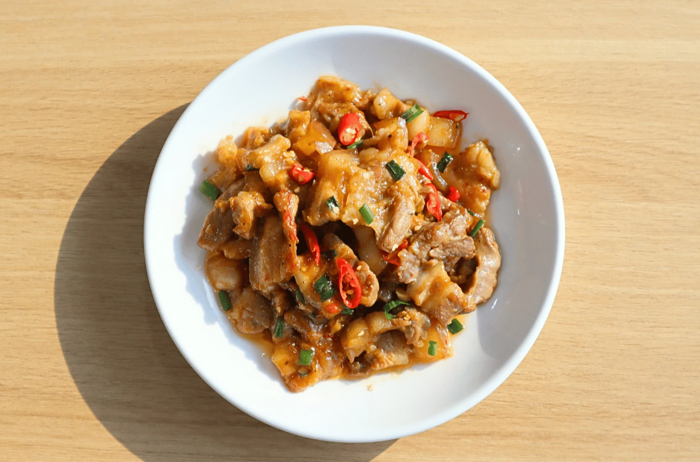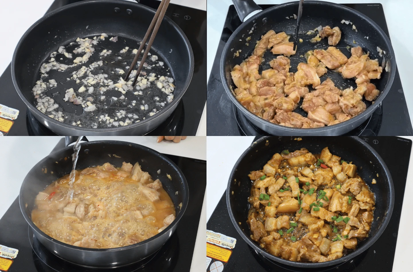 Phi thơm hành, tỏi với chút dầu, sau đó cho thịt đã ướp vào xào cho săn lại. Tiếp tục cho thêm khoảng 500 ml nước lọc rồi đun sôi. Khi nước bắt đầu sôi, giảm lửa và kho liu riu cho đến khi nước rút sệt lại. Cuối cùng, cho thêm hành lá và ớt tùy theo sở thích.