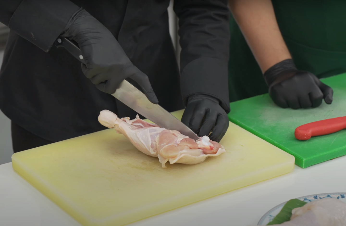 Đầu tiên, bạn cứa gân góc chân để tách thịt dễ dàng hơn. Tiếp tục cắt dọc má đùi và lách dao nhẹ nhàng để lấy hết phần thịt bám trên xương. Sau đó, cắt phần thịt thành những miếng phi lê vừa ăn.