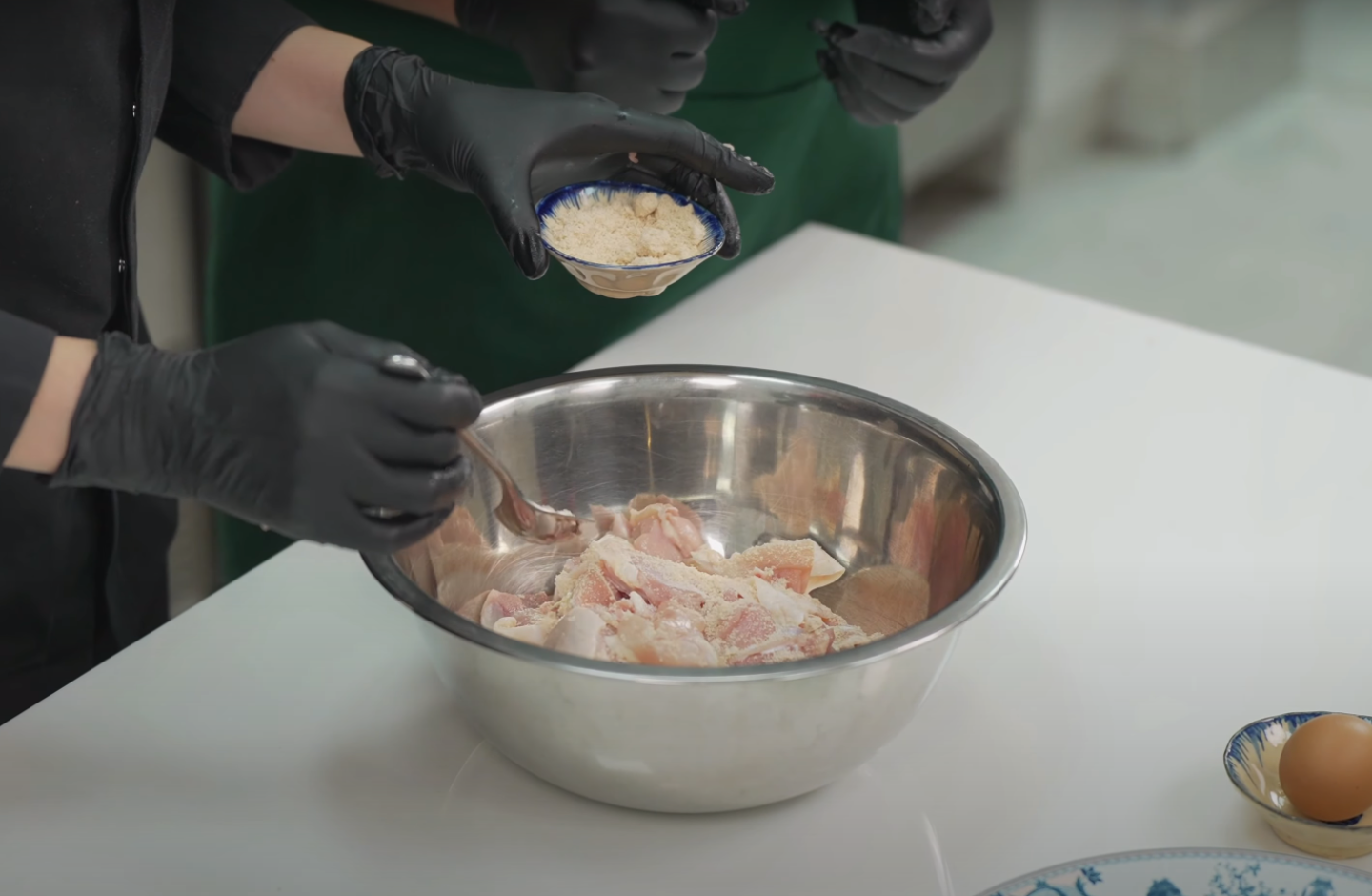 Cho 10g bột nêm gà, 5g dầu mè và 1 quả trứng gà vào rồi trộn đều. Tiếp theo, áo đều bột chiên giòn và bột năng lên thịt gà để chiên gà giòn đều.