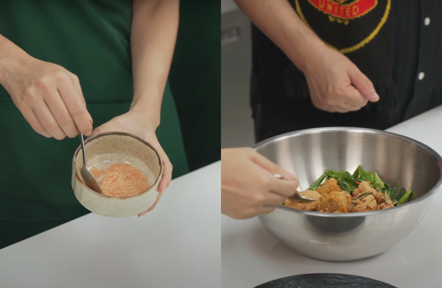 Sau đó, bạn cho phần muối vào phần gà đã chiên và lắc đều.