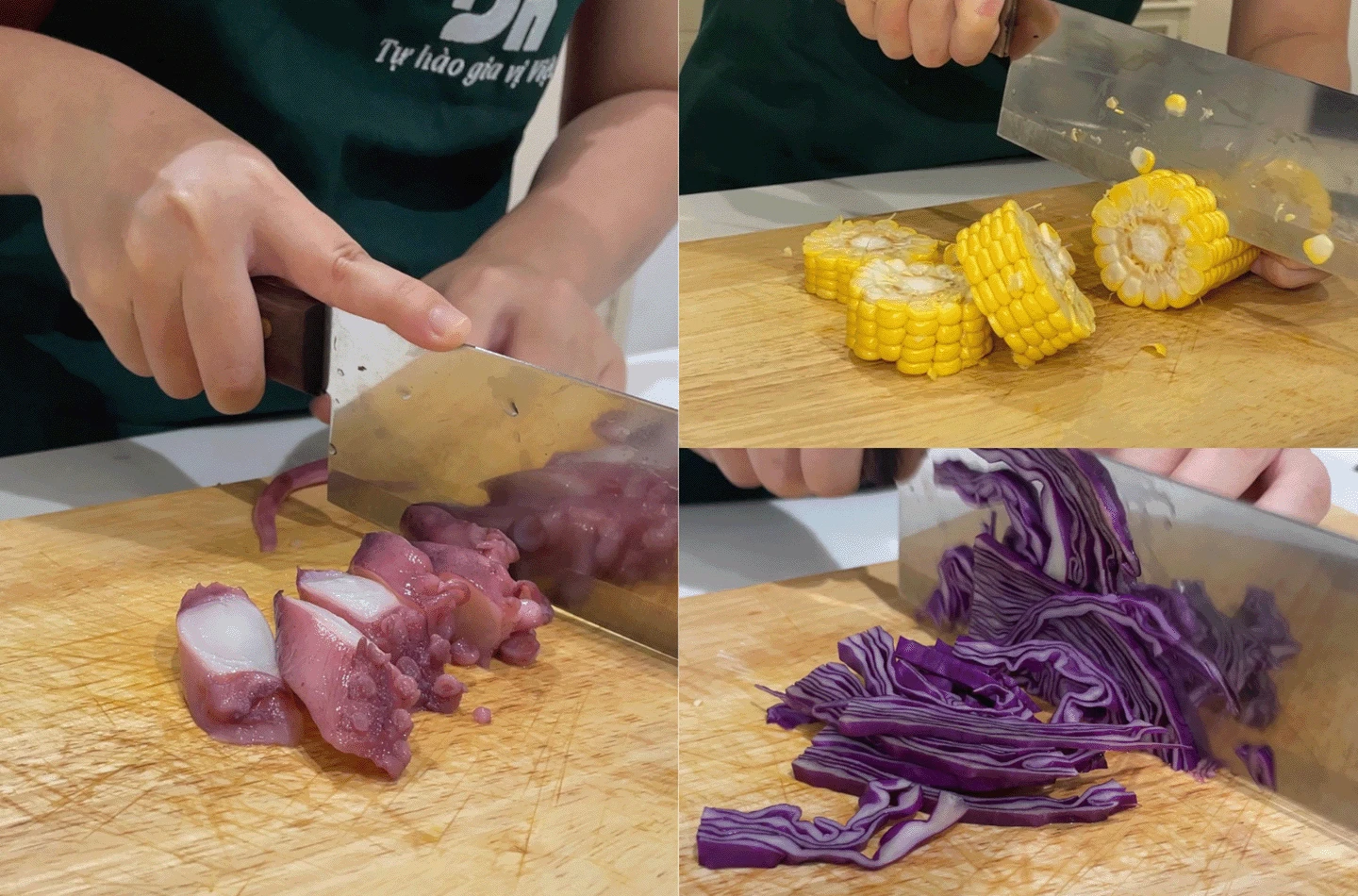 Tiếp theo, bạn cắt bắp thành khoanh, cắt hành tây làm 4 và bắp cải thì cắt sợi. Nấm kim châm cắt bỏ phần gốc.