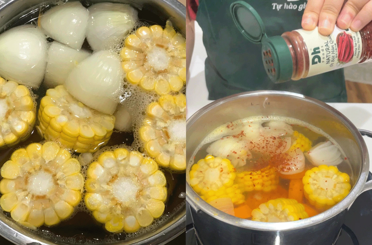 Đầu tiên, bạn bắt nồi nước lên bếp. Khi nước sôi, bạn cho bắp và hành tây vào để ninh trong 30 phút cho nước ngọt thanh.