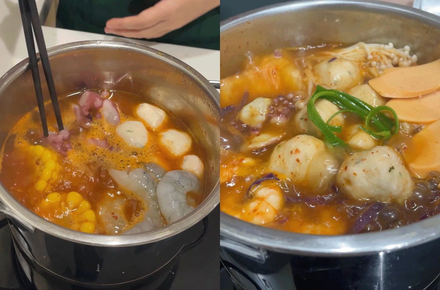 Bạn cho lần lượt cá viên, xúc xích, tôm, mực, và thịt bò vào nồi. Đợi đến khi nước sôi và các nguyên liệu chín tới, bạn cho mì vào và đun với lửa vừa trong 3 - 5 phút.
