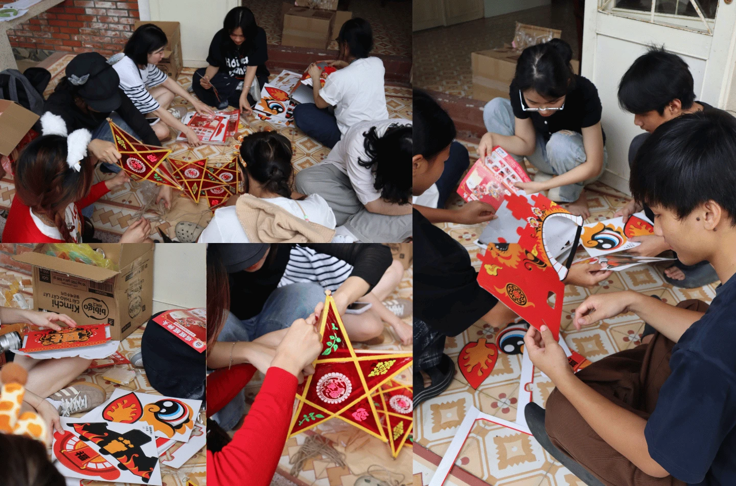 Các thành viên Dh Foods và các bạn tại Làng cùng hoàn thiện những chiếc lồng đèn