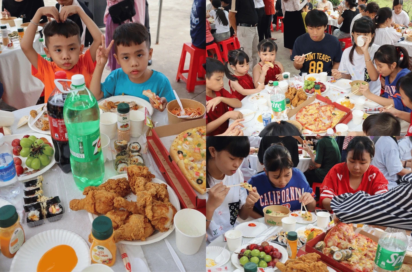 Khi sân khấu lên đèn cũng là lúc bữa tiệc mà các em mong chờ nhất bắt đầu. Một "đại tiệc" thịnh soạn với gà rán giòn rụm, pizza thơm lừng,.. được bày ra khiến bạn nhỏ nào cũng thích thú.