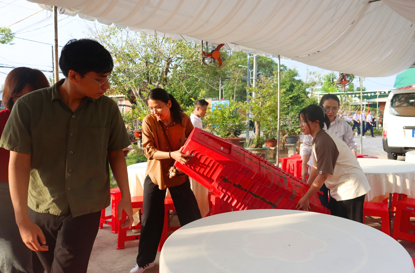 Đã trải qua một đêm dài vượt gần 300km từ Sài Gòn về Cà Mau, nhưng khi vừa đến Làng, các thành viên của Dh Foods ngay lập tức tất bật vận chuyển đồ đạc, quà tặng và vật dụng để tổ chức chương trình Tất Niên cho các em.